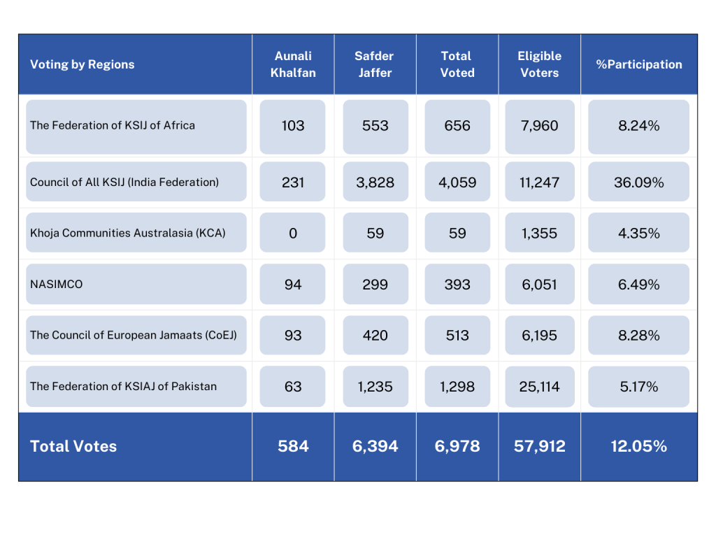 The count was made in the presence of the two Executive Councillors, Dr Husein Jiwa and Br Rasool Bhamani elected by the Executive Council to witness the count.