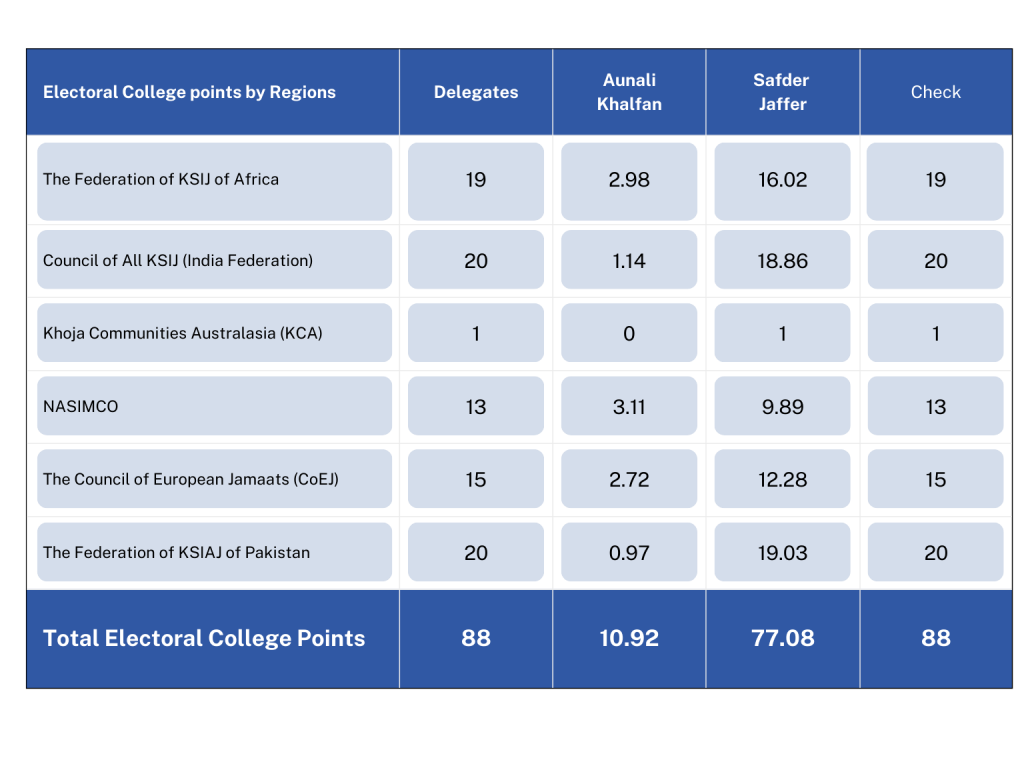 We, the Electoral Commission of the term 2021-2024 elected to conduct the election of any post of The World Federation of KSIMC, hereby declare that based on the ballots cast submitted to us by the Federated Members of The World Federation of KSIMC within the specified time and counted by us, hereby declare that Safder Jaffer having received the largest number of electoral college points has been duly elected as The President of The World Federation of KSIMC for the term 2024-2027.