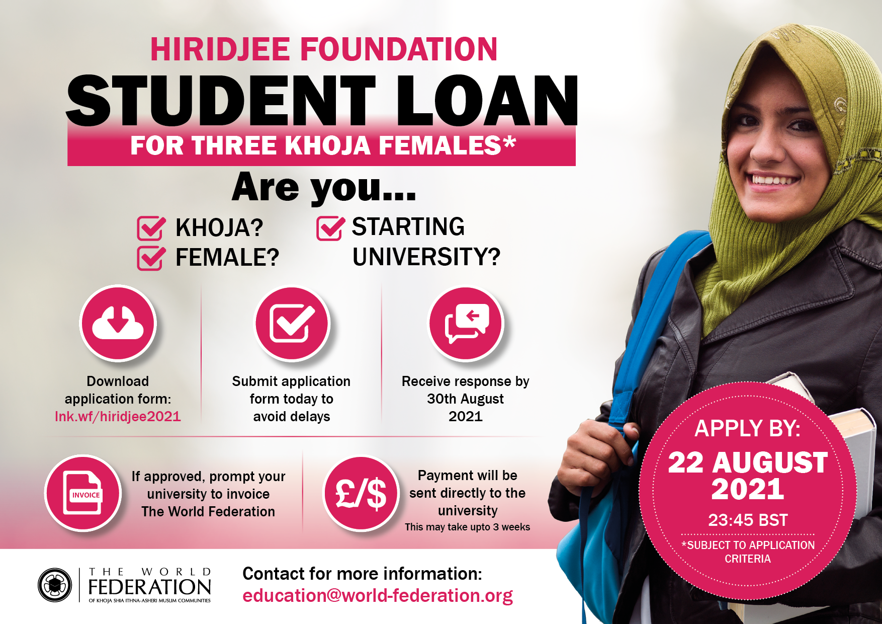 We are offering this is a once in a lifetime opportunity, aimed at just three Khoja females who have a desire to study but have some financial constraints preventing them from covering their tuition fees. The World Federation and the Hiridjee Foundation are incredibly passionate about encouraging the female members of the Khoja community to further their education in an undergraduate course and kick-start their careers and this loan is a great first step towards this.